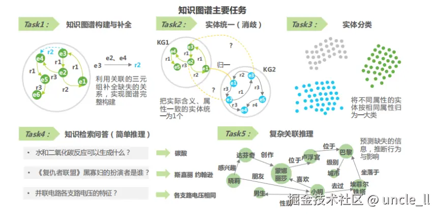 这些任务是知识图谱技术应用的核心,涵盖从基础构建到高级推理的各个方面,是实现知识管理和智能应用的关键步骤。