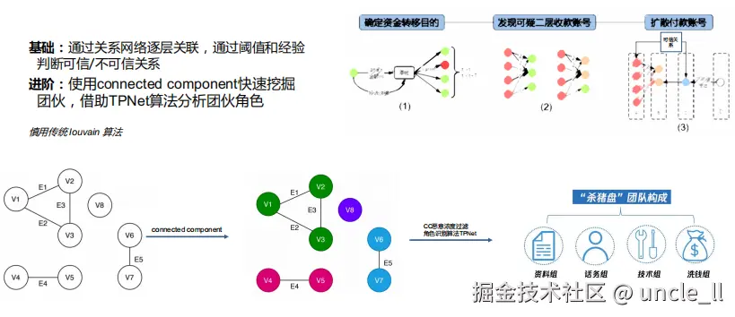 - 基于专家经验的团伙识别:自动化挖掘团伙识别规则,利用社区发现技术识别潜在团伙结构。