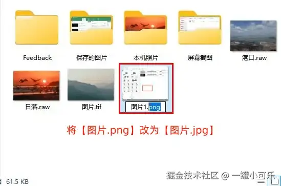 更改图片文件的扩展名也可以解决图片格式如何转换的问题,具体的操作步骤是将【图片.png】改为【图片.jpg】,并点击确定即可。