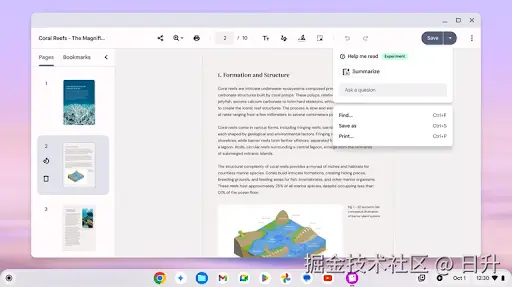 在 ChromeOS 上帮助我阅读提供了一个 AI 驱动的解决方案,帮助快速找到任何文本中所需的信息。只需右键单击空白区域,即可在现有上下文菜单上方显示“帮助我阅读”卡片,轻松获取在浏览器和图库中阅读内容的要点。帮助我阅读面板展示了文本的摘要和一个自由问答字段,允许询问有关文本的具体问题。仅在 Chromebook Plus 设备上可用。