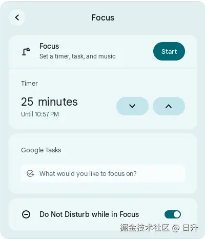 设计了“专注于 ChromeOS”功能,以帮助用户减少干扰,创建更高效的工作空间。通过“专注”,可以轻松设置和调整专注时间,启用或禁用请勿打扰(DND)模式,整理或创建新的 Google 任务,并沉浸在精选的播放列表中,这些播放列表可以帮助更好地专注,包括专注音效等。