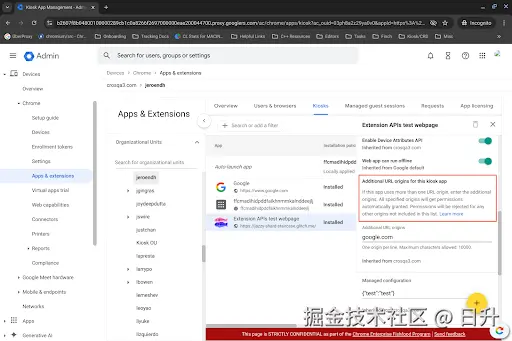 如果 Kiosk 应用使用多个 URL 源,IT 管理员现在可以输入额外的源。所有指定的源将自动获得权限。任何不在此列表中的其他源将被拒绝权限。