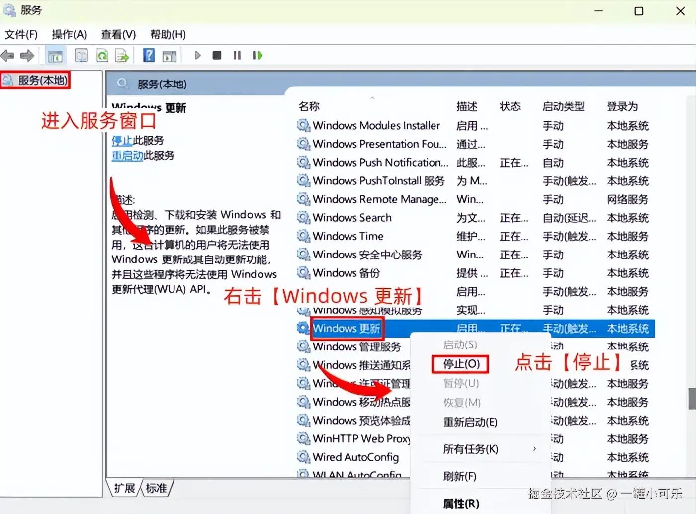 Win10怎样关闭自动更新?大家可以打开电脑的服务窗口,关闭系统更新的设置即可。具体的操作步骤是在电脑键盘上按下【Win+R】组合键,在运行窗口的输入框中输入【services.msc】,按下【Enter】进入服务窗口,在窗口中找到并右击 【Windows 更新】 选项,点击【停止】即可关闭Win10自动更新。