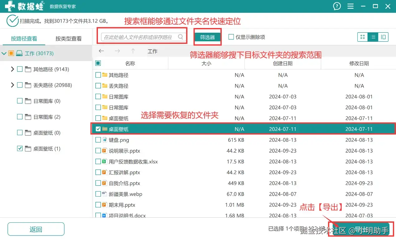 步骤2:等待软件的扫描工作结束后,在页面的右边会出现扫描文件,用户可以借助【搜索框】、【筛选器】等辅助工具帮助自己找到需要恢复的整个文件夹。找到需要恢复的文件夹后点击【导出】。