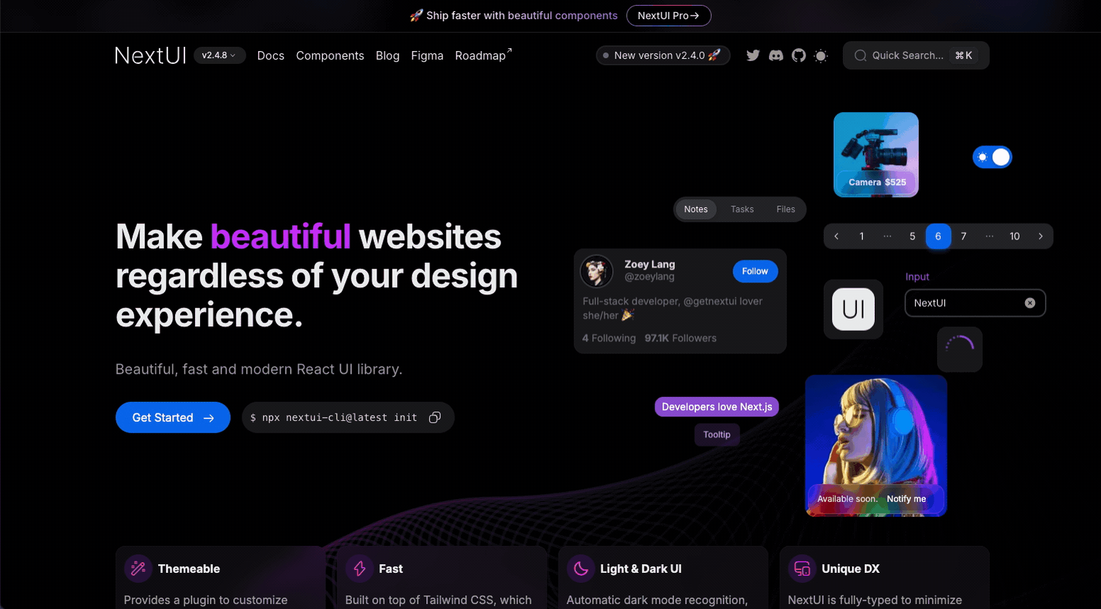 - 现代设计:NextUI 提供了一套美观且现代的 UI 组件,符合当今设计趋势,能够提升应用的视觉吸引力。