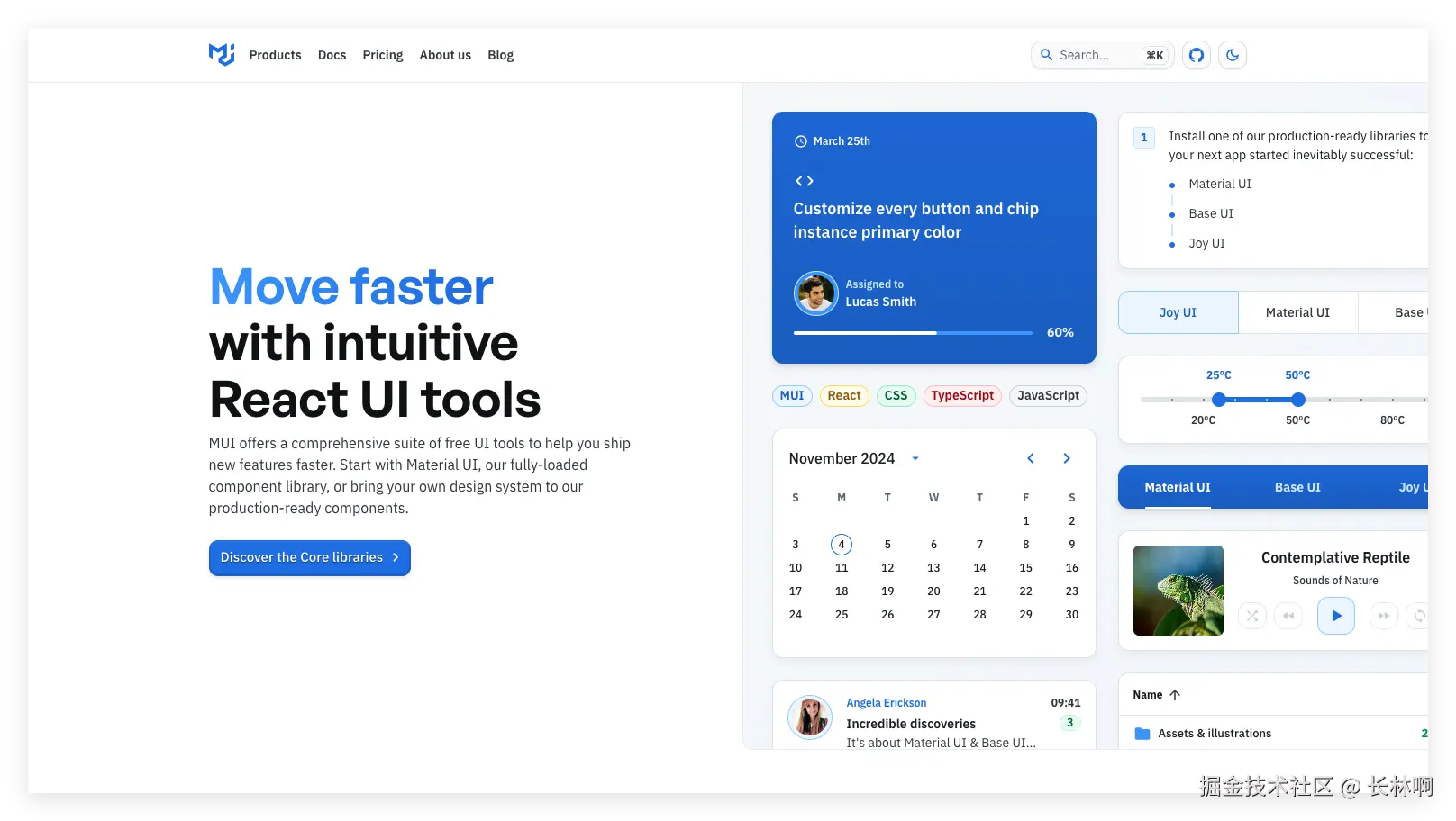 Material UI 是一个开源的 React 组件库,基于 Google 的 Material Design 规范实现。它包含一个全面的预构建组件集合,开箱即可在生产中使用,并具有一套自定义选项,可以轻松地在我们的组件之上实现你自己的自定义设计系统。