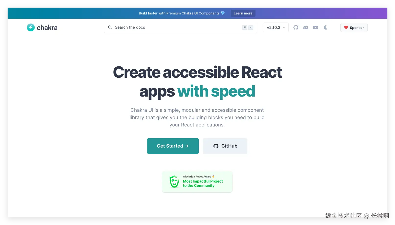 Chakra UI 是一个全面的可访问、可重用和可组合的 React 组件库,可简化现代网络应用程序和网站的开发。目前已经迭代到 v3 版本(2024年10月22日发布),可轻松构建复杂的用户界面,同时遵循可访问性最佳实践。