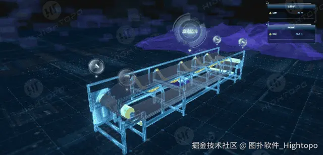图扑 HT 三维可视化技术的核心在于实时动态呈现输煤皮带的运行状态、设备故障告警和传感器信息。