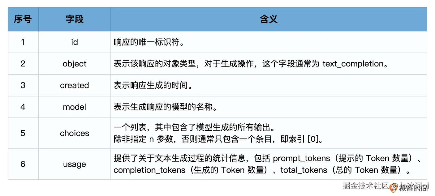 当你调用OpenAI的Completion.create方法时,它会返回一个响应对象,该对象包含了模型生成的输出和其他一些信息。这个响应对象是一个字典结构,包含了多个字段。
