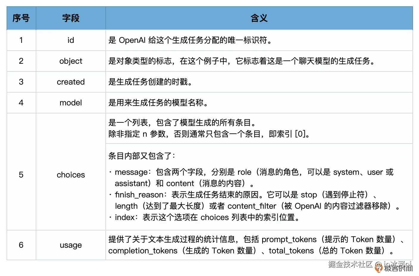 - finish_reason:模型停止生成的原因,可能的值包括 stop(遇到了停止标记)、length(达到了最大长度)或 temperature(根据设定的温度参数决定停止)。