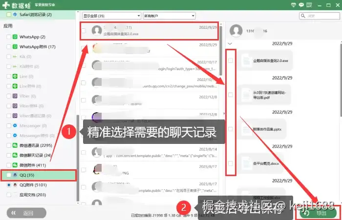 步骤2:软件会自动为您扫描可恢复的数据,扫描完毕后我们选择 【QQ】 选项,查看并自由勾选您需要的聊天记录进行恢复并导出保存。