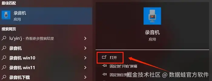 步骤1: 点击左下角的Windows图标,找到 “录音机” 功能。然后点击麦克风图标,就可以开始录制音频啦!