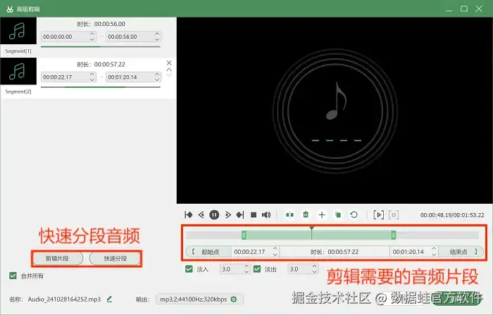 4、后期编辑: 软件内置后期编辑功能,支持设置音频格式、快速分段、快速合并音频等操作。