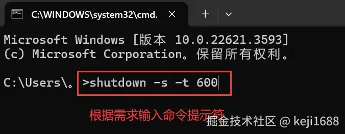 步骤2:在命令提示符窗口中,输入 【shutdown-s-t[秒数]】 命令。如想让电脑在10分钟后关机,可以输入 【shutdown-s-t600】 ,按下回车键即可设定成功。