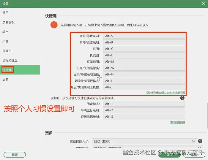 备注: 默认开始/结束电脑录制屏幕快捷键 “Alt+S” ;默认暂停/继续电脑录制屏幕快捷键 “Alt+R” 。