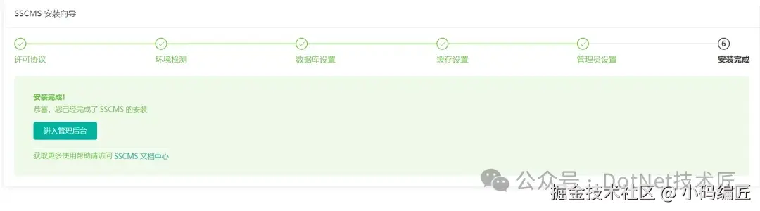 SSCMS 在产品安装完成后,会出现进入后台的链接,如下图所示: