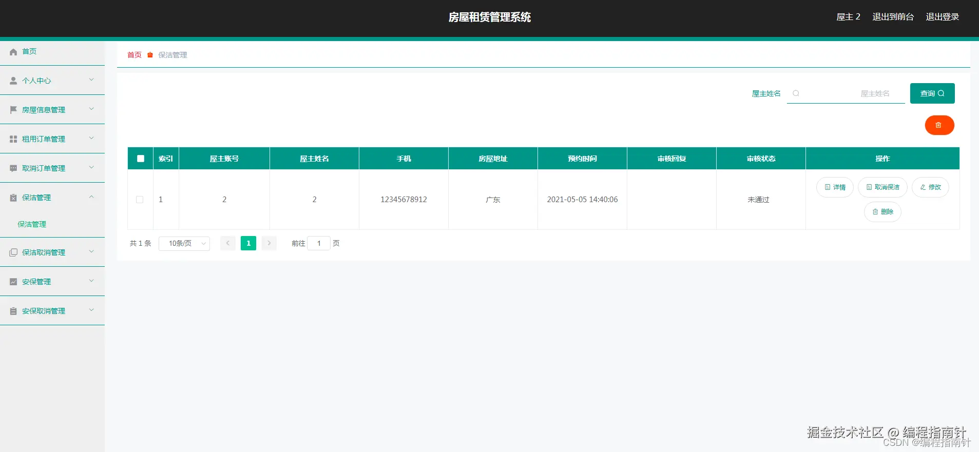 屋主进入指定功能操作区之后可以管理保洁信息。其页面见下图。屋主在当前页面可以取消保洁,可以查看预约的保洁信息是否通过管理员审核。
