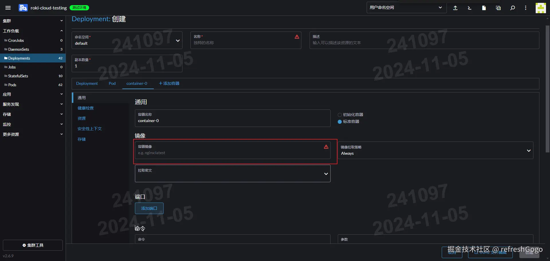 在Rancher中创建一个新deployments,并且填入刚刚我们推送到远端仓库的镜像地址与一些必要信息即可。