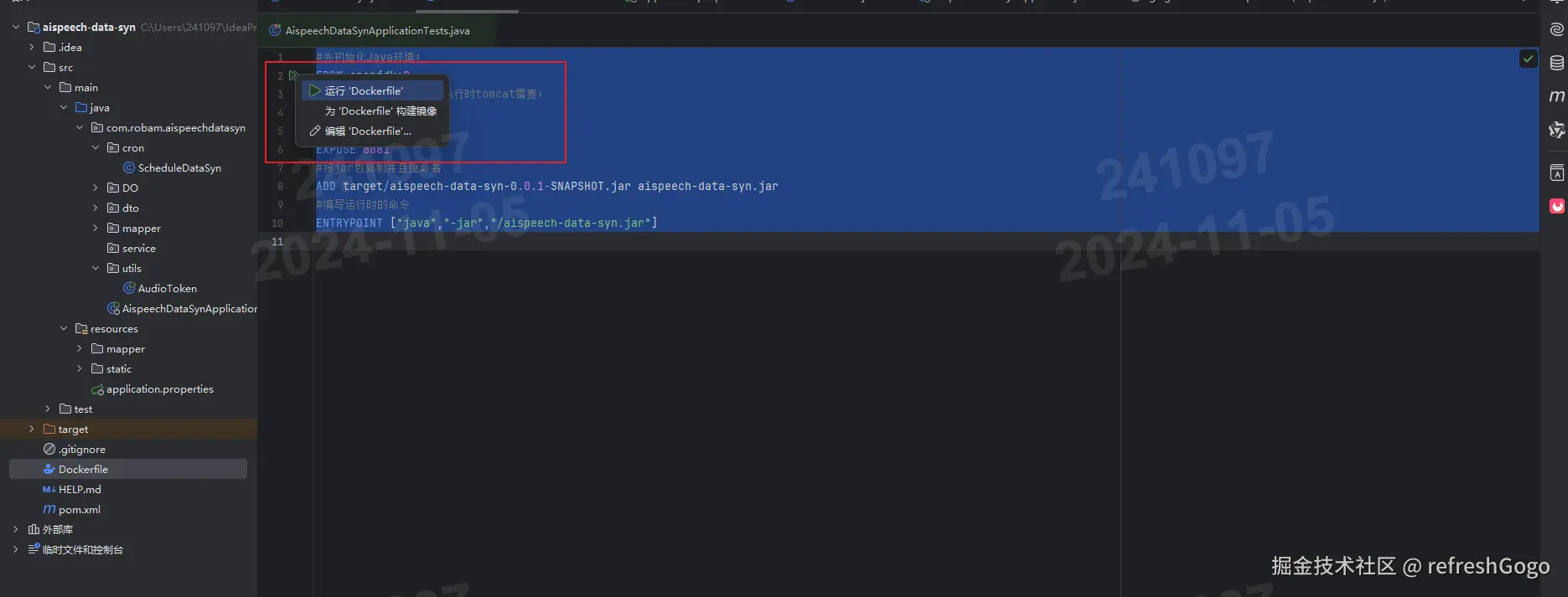 注意点:dockerfile文件需要建立在与pom文件同级下,以下是最简单的一个dockerfile文件示例