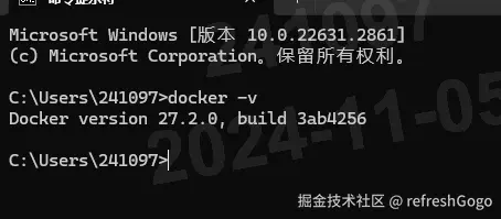 我目前使用的windows环境,下载docker desktop软件,安转完成后docker环境会在自动在windows环境下部署。cmd命令行中输入: