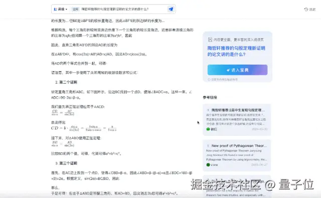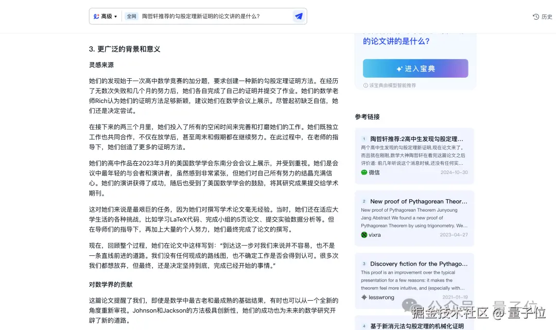 首先,这个国产 AI 搜索,它会先铺垫一些背景知识,包括什么是勾股定理,以及 2 位高中生新证明的故事概要。