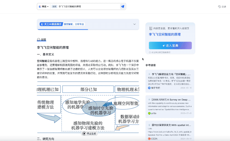 而且从天工 AI 搜索的资源来看,它没有仅限于我们提问的 “原理”,也做了相应的发散,包括定义、研究方向和应用等。