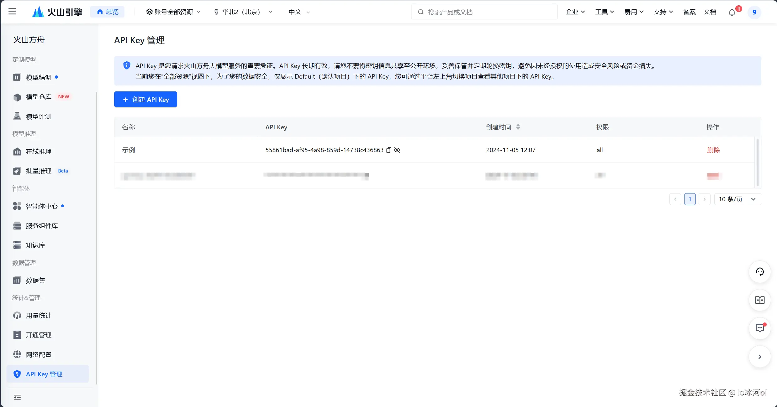 向大模型的官网注册账号并申请自己的API KEY (此时的API KEY只是一个钥匙,你还需要申请具体的模型才能能用,钥匙只是起到在传输过程中的保密作用)