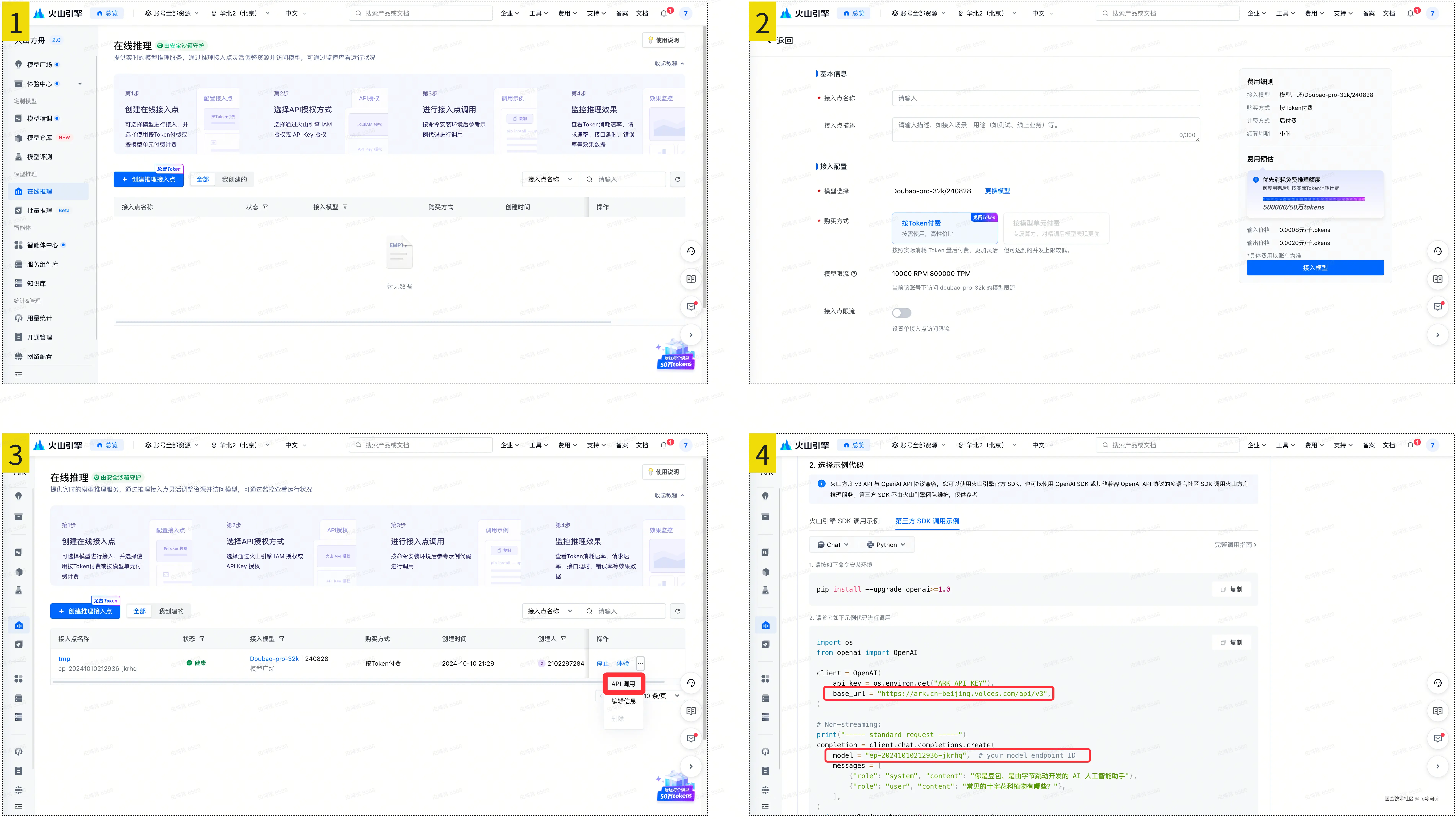 笔者在写到这里的时候才被人提醒AI练中学里有操作文档,那就直接偷图好了(感恩由鸿铭8588),省的一个一个截屏。在控制台的 在线推理页面 中创建推理接入点,推荐使用doubao-pro-32k作为主力模型,模型部署完成后即可获得模型的base_url和model_endpoint