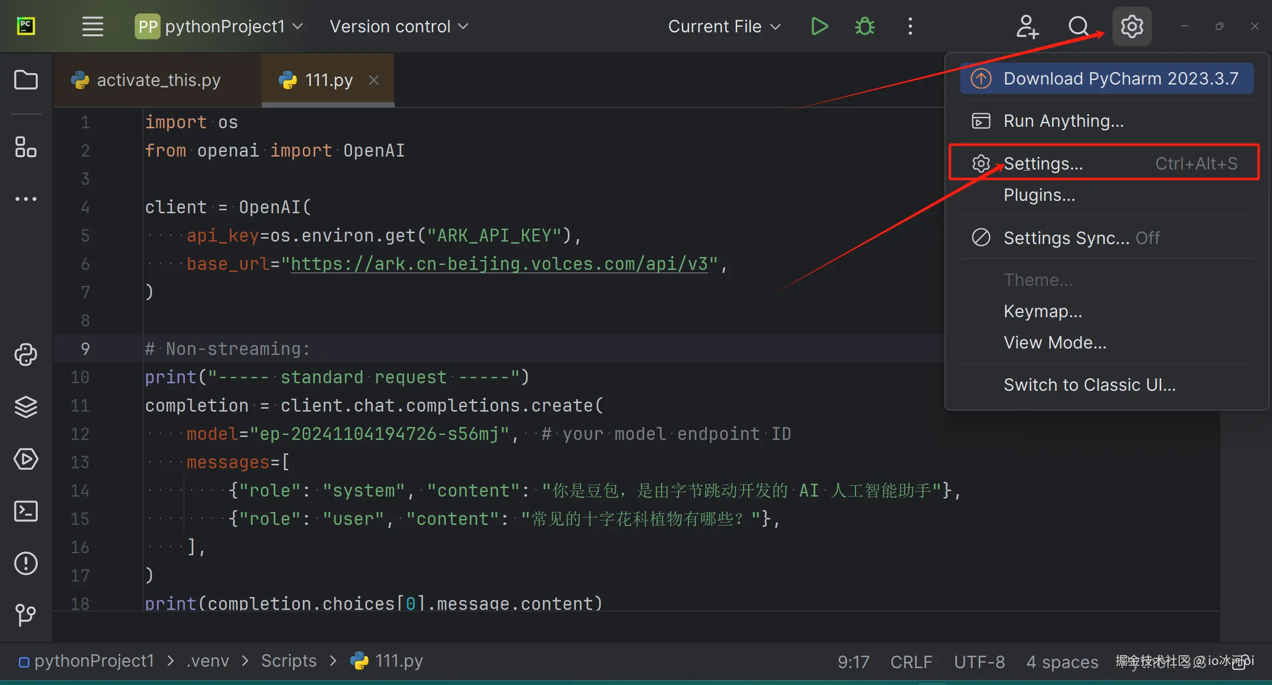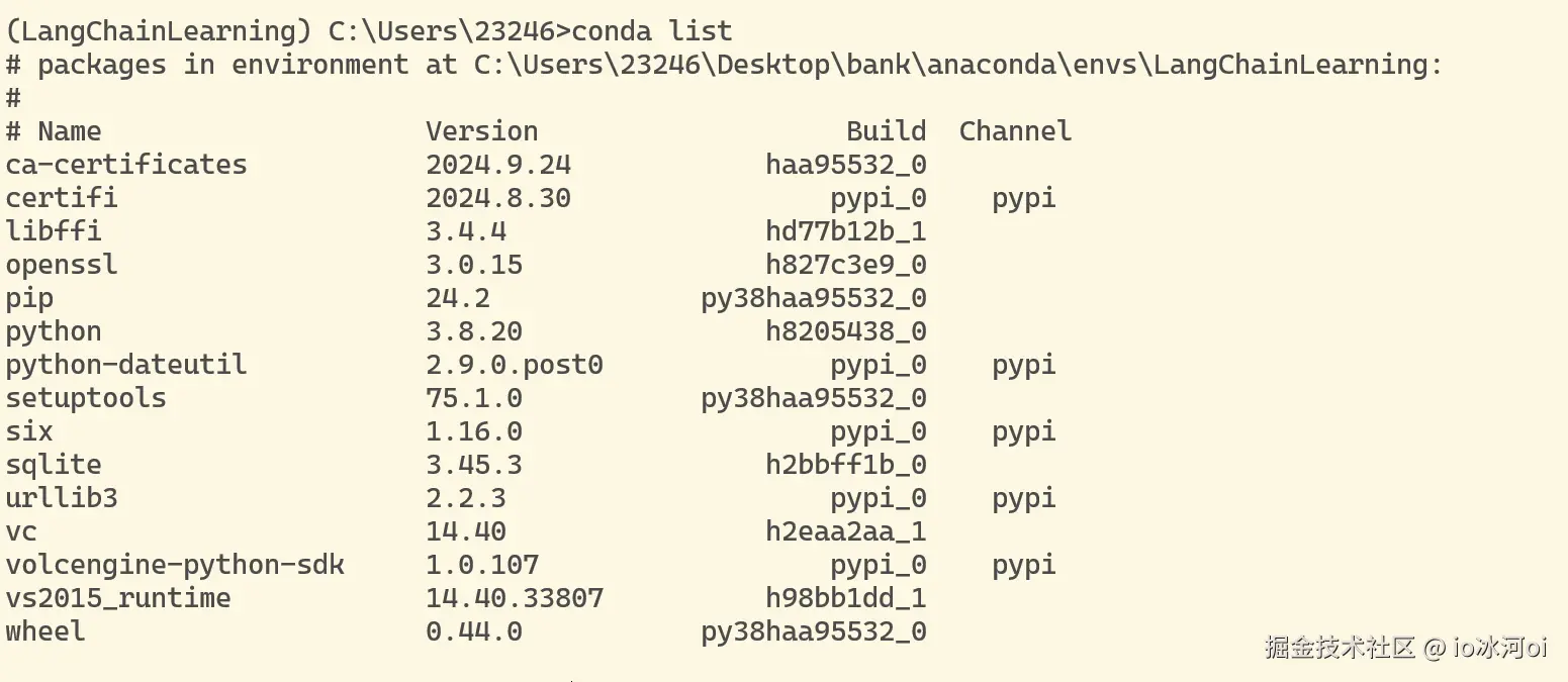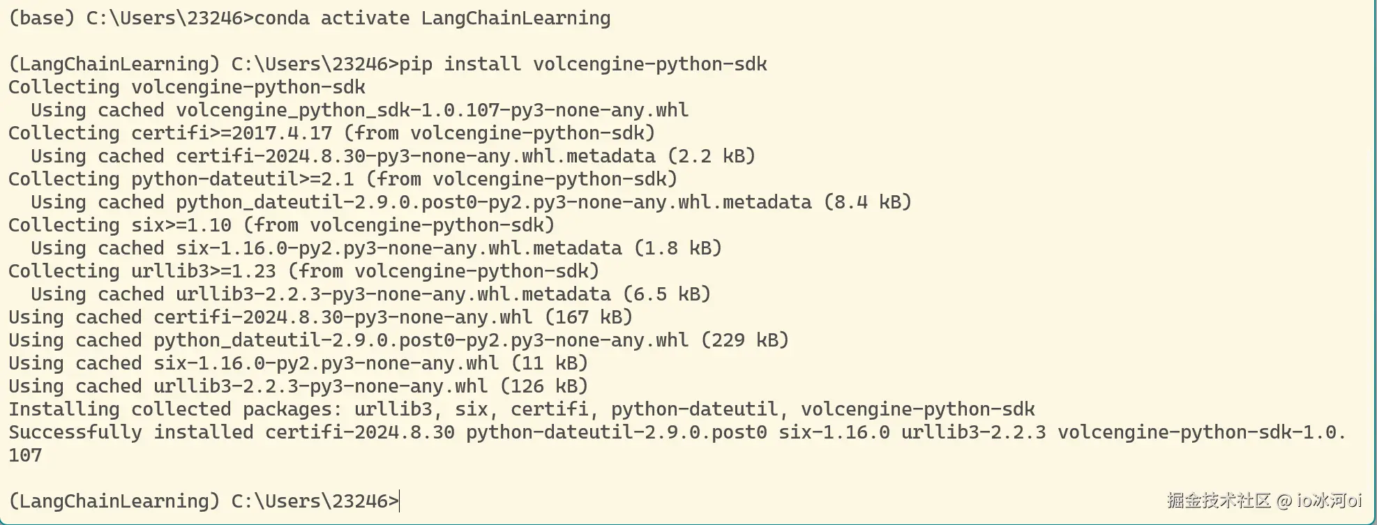 细心的同学可能已经在火山大模型的官网上看到了,火山大模型也是支持OpenAI这个库的。两者的标准是兼容的,所以我就先用anaconda_prompt安装火山引擎官方提供的库,然后再在pycharm上演示如何安装OpenAI的库。毕竟我们课程的示例代码是以OpenAI库为主。