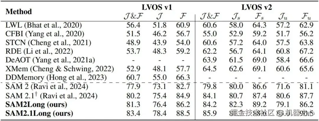 这些结果表明,SAM2Long 在保留 SAM 2 基础分割能力的同时,显著增强了其长时间视频场景下的表现,展现了其在不同 VOS 基准数据集上的鲁棒性和通用性。
