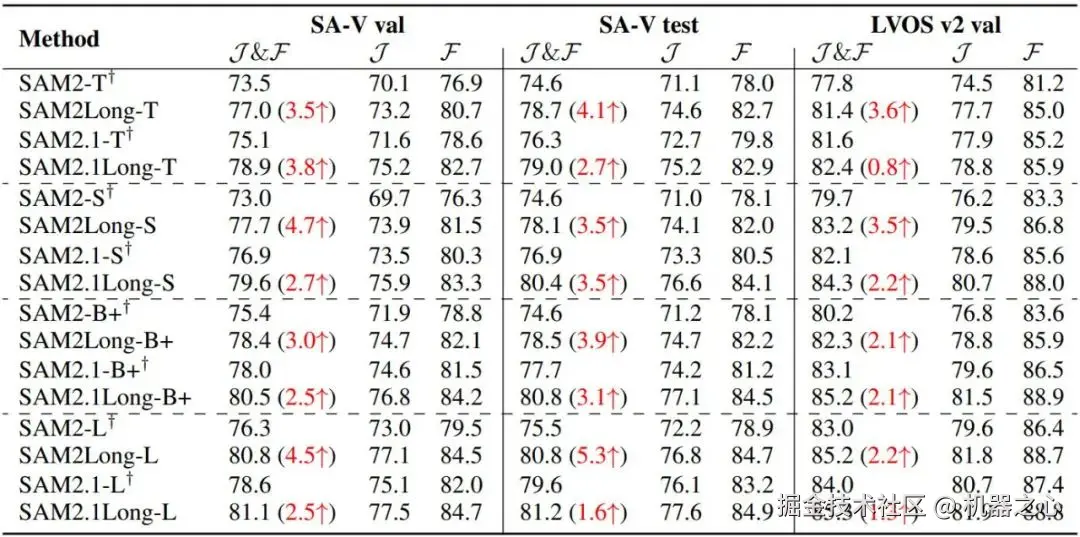我们对 SAM 2 和 SAM2Long 在不同模型规模和多个数据集上的表现进行了详细对比。在 SA-V 验证集和测试集以及 LVOS v2 验证集上的实验结果显示,SAM2Long 无论在何种模型规模下,均显著超越了 SAM 2。表中共包含了 8 种模型变体,涵盖了 SAM 2 和最新的 SAM 2.1 在四种模型规模下的表现。24 次实验的平均结果表明,SAM2Long 在 J&F 指标上平均提高了 3.0 分。