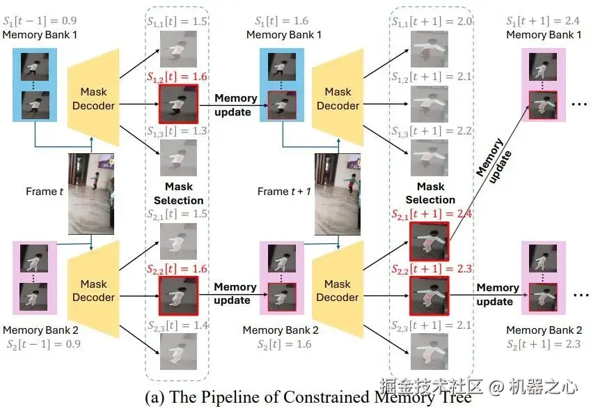 为了提高 SAM 2 在长视频中的鲁棒性,SAM2Long 引入了多路径记忆树结构。该结构允许模型在每个时间步上保留多个分割路径假设,每条路径都有独立的内存库和累积得分。每个时间步上,SAM2 的掩码解码器在每条路径会生成三个掩码候选。