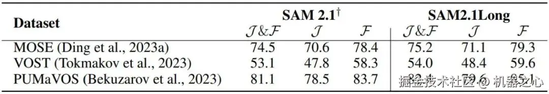 同样,在关注对象变形的 VOST 数据集上,SAM2.1Long 的 J&F 得分为 54.0,较 SAM 2.1 提升了接近 1 分。而在 PUMaVOS 数据集上,SAM2.1Long 也以 82.4 分超越了 SAM 2.1 的 81.1 分,证明了其在处理复杂和模糊分割任务时的强大能力。