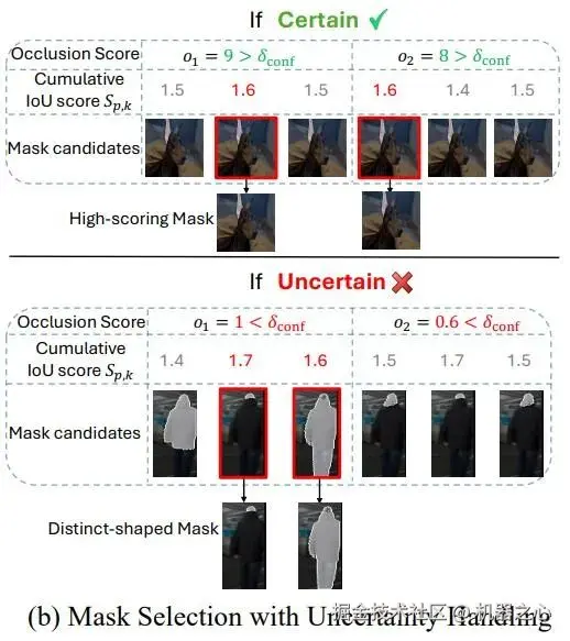 此外,SAM2Long 在处理不确定场景时,利用遮挡分数进行不确定性处理。当所有路径的遮挡分数都较低时,意味着模型对输出的结果不确定。在这种情况下,SAM2Long 会强制选择不同 IoU 值的掩码路径,以避免错误路径的过早收敛。