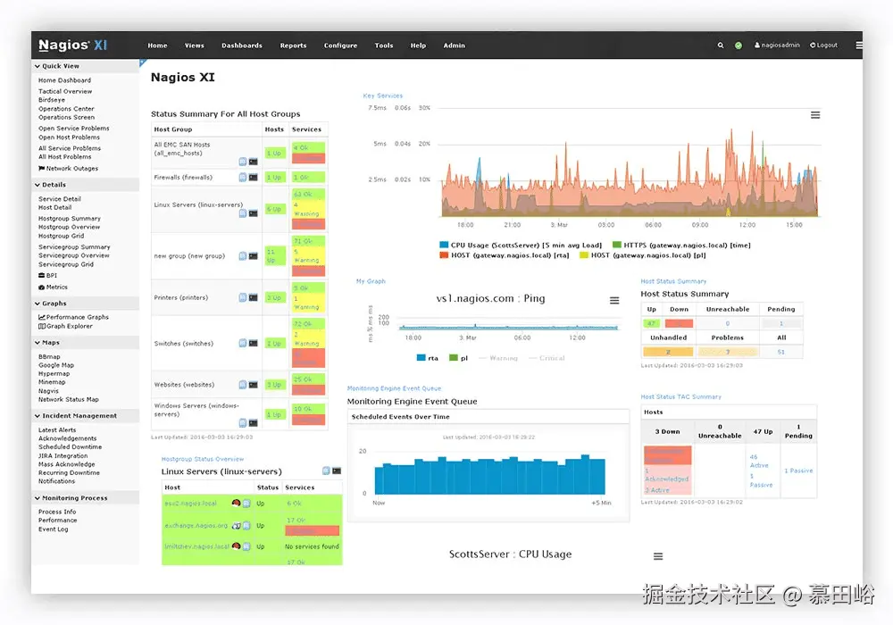 Nagios 是一款经典的开源监控软件,适用于网络监控和服务器性能监控。Nagios Core 提供了基础的监控能力,用户可以实时监控系统的健康状态、带宽占用和硬件资源利用率,及时发现潜在故障。它的报警系统也非常灵活,支持通过邮件、短信等方式通知管理员。