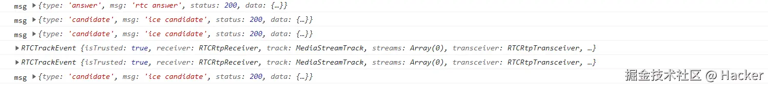 在双方监听的 pc 核心方法ontrack中,就能拿到双方的音频和视频信息了 ( B 能显示 A 音频 就是靠从ontrack拿到 A 的音频数据 然后显示到 B 的 Vidio 标签中)