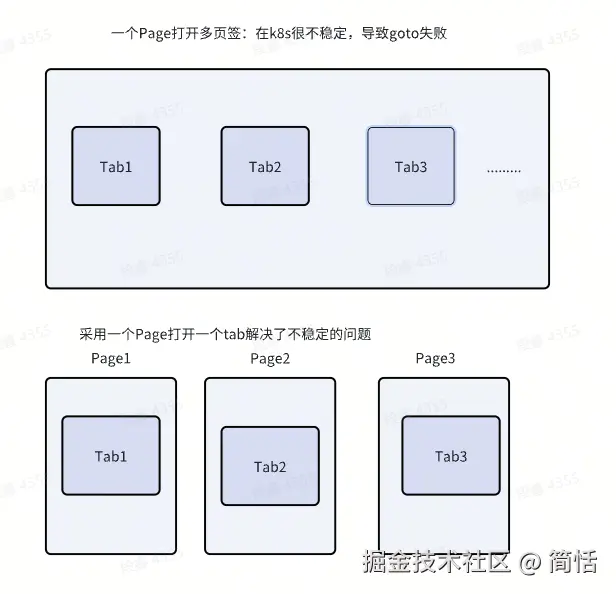 查了很久的原因,发现上述流程是启动一个浏览器实例,多个tab页(page)的时候,在k8s里面会经常goto失败,监控内存和cpu都显示正常,但是经常会失败,导致PDF生成失败;