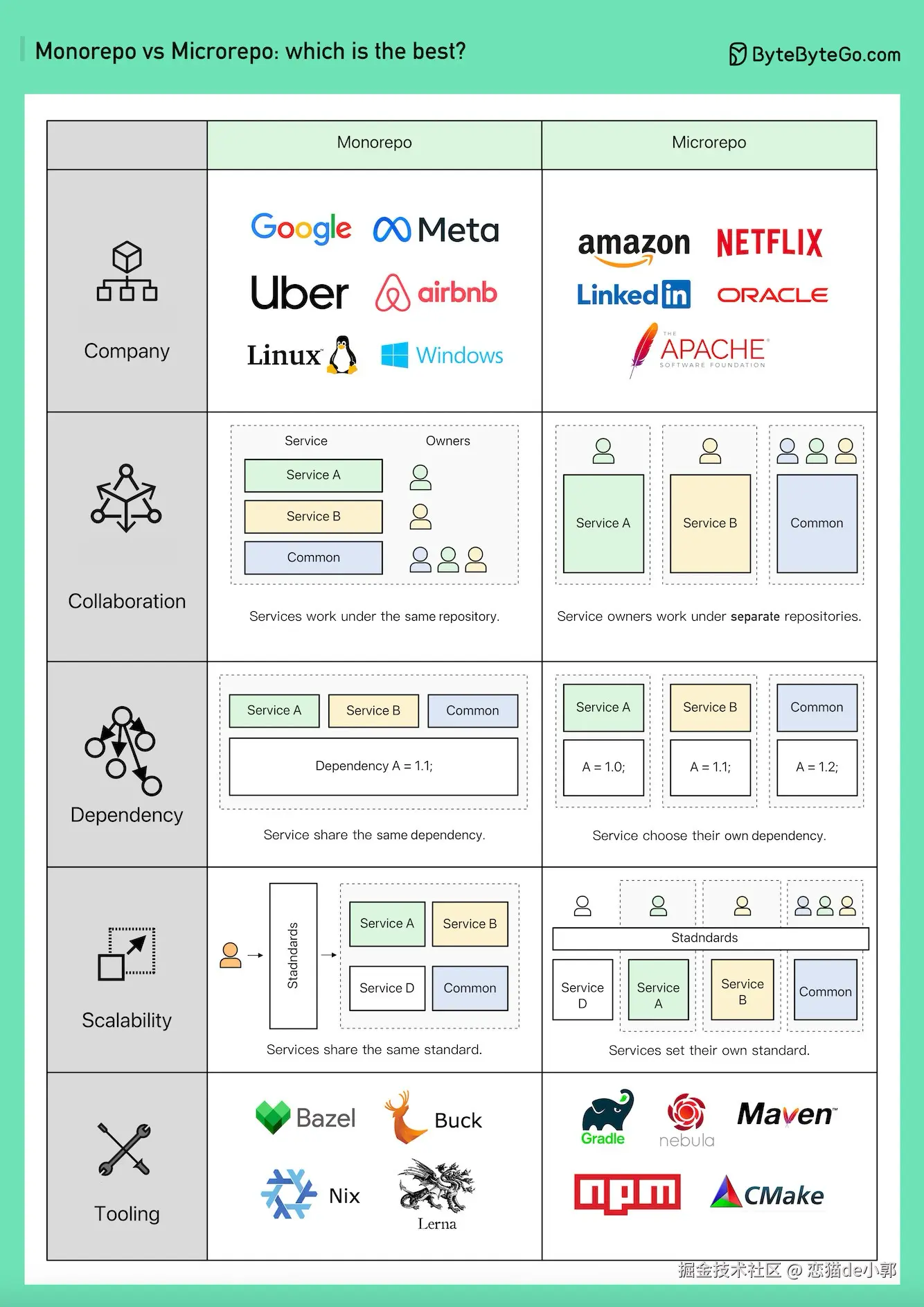 monorepos 也不是什么新概念,很早之前 Google、Meta、Microsoft、 Twitter 等公司都在大规模使用 monorepos ,比如 React 、 Vscode 、Babel 都使用了 monorepo,如下图所示可以看出来他们在形式和结果的区别: