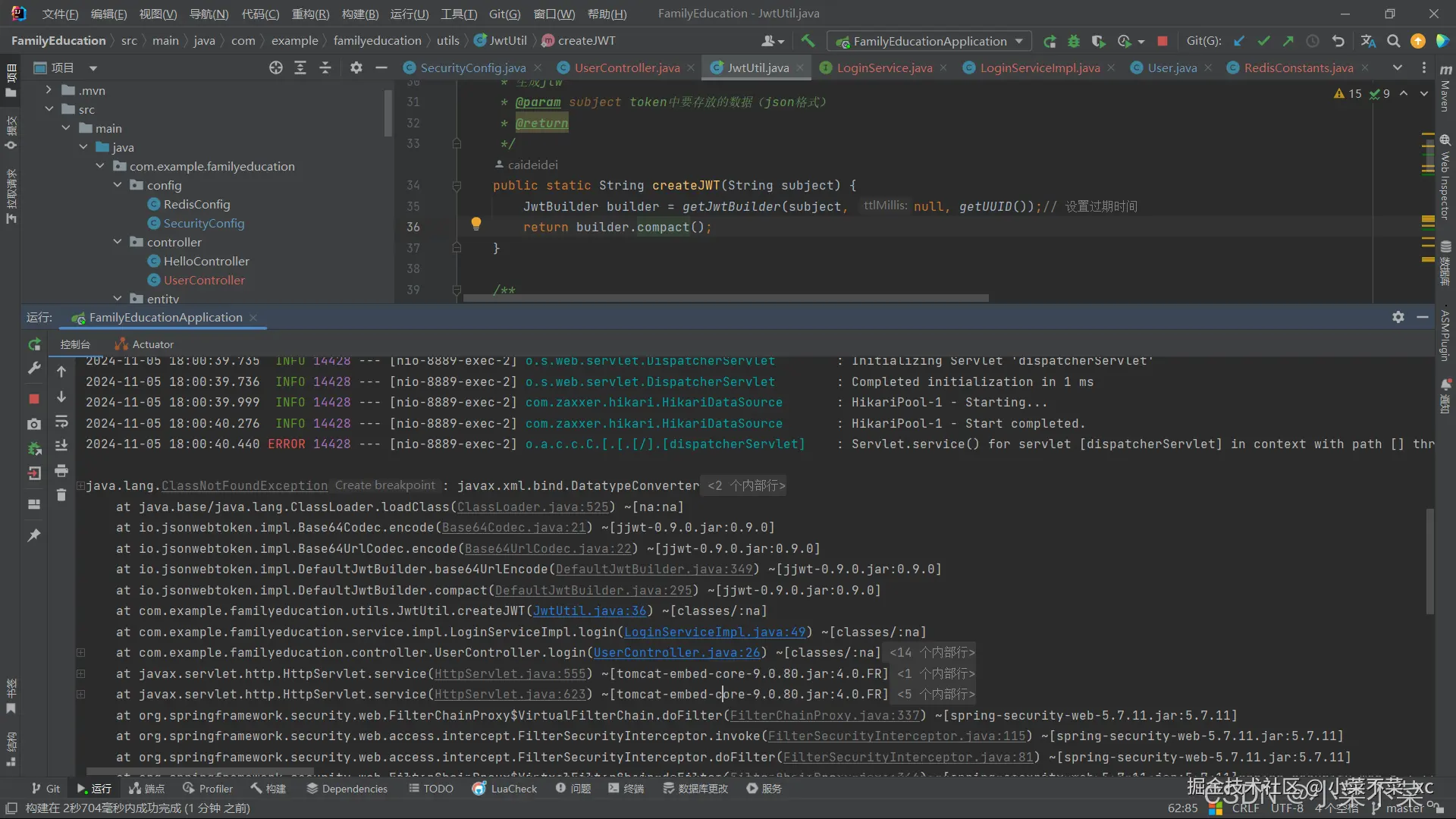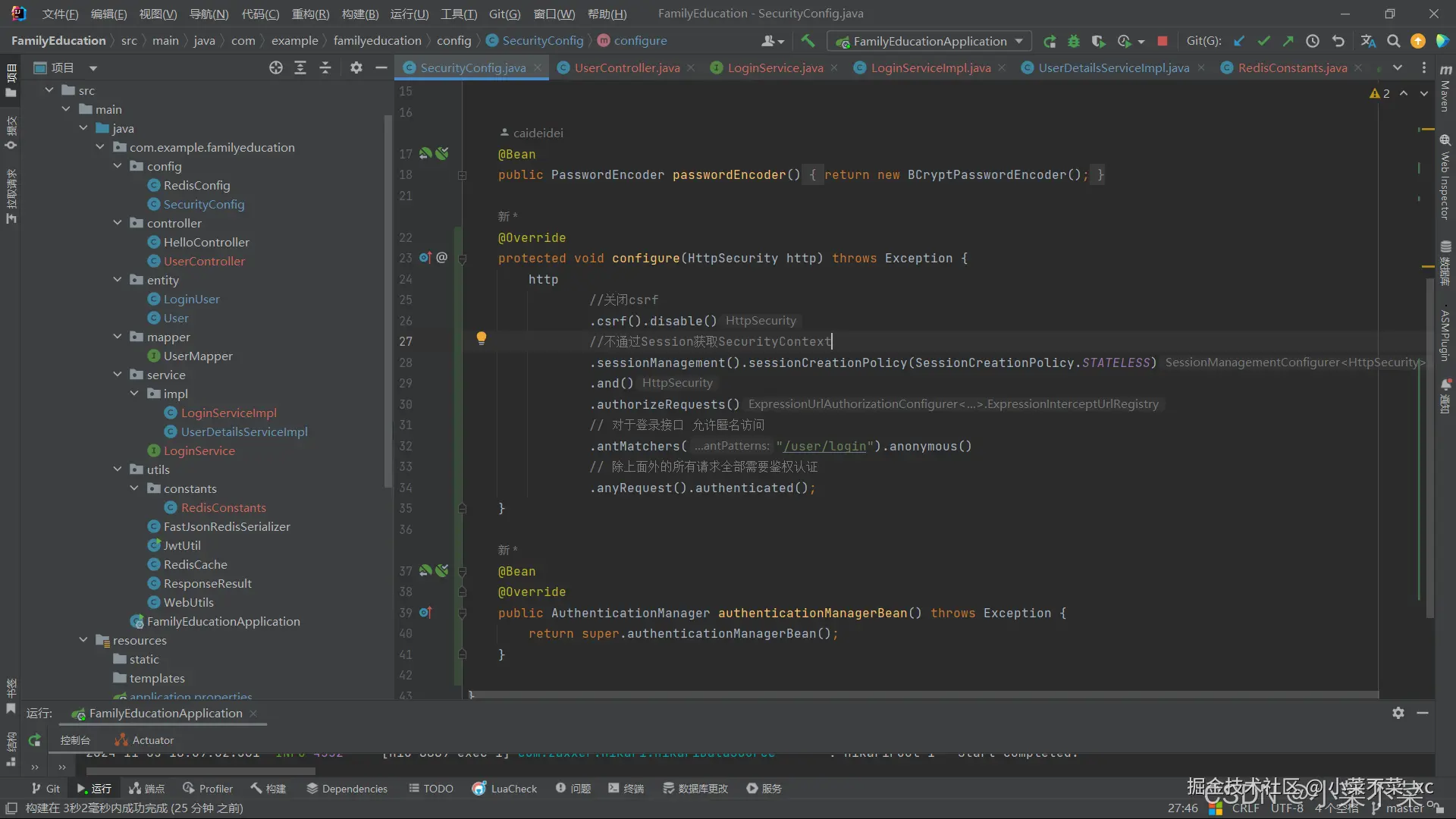 接着我们去配置一下SpringSecurity依赖,对/user/login放行并把AuthenticationManager注入容器。后面会对AuthenticationManager进行解释