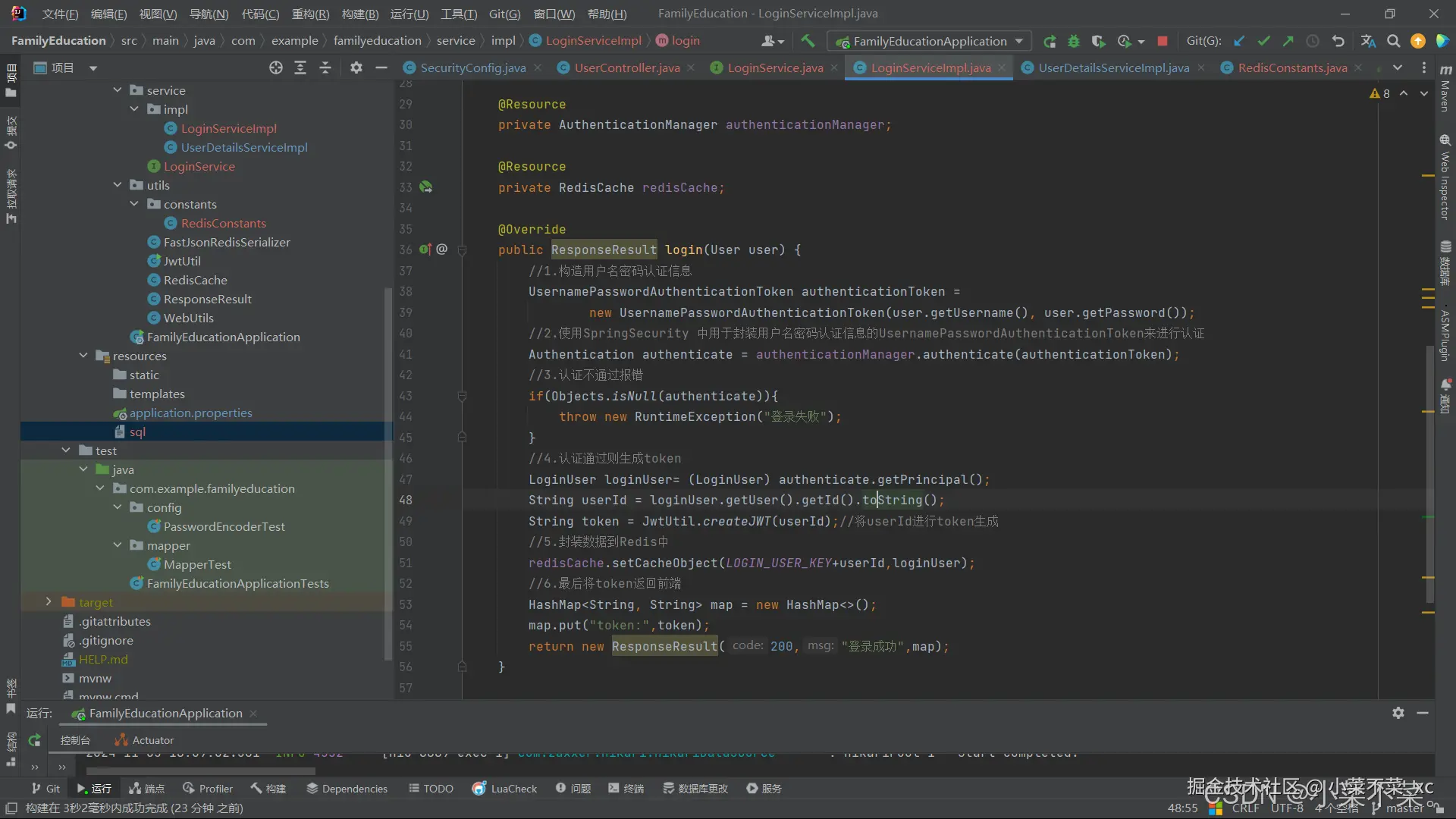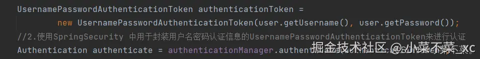 这两行代码的作用是先构造用户名密码认证信息,接着把认证信息给authenticationManager进行认证,认证时会触发UserDetailsService的 loadUserByUsername() 方法。而我们之前已经编写过UserDetailsServiceImpl并重写了 loadUserByUsername() 方法,通过这个方法从数据库中查询数据并返回进行验证,认证过程中密码有加密,还会通过配置的 PasswordEncoder 比对密码是否匹配,认证成功后生成认证信息 Authentication。