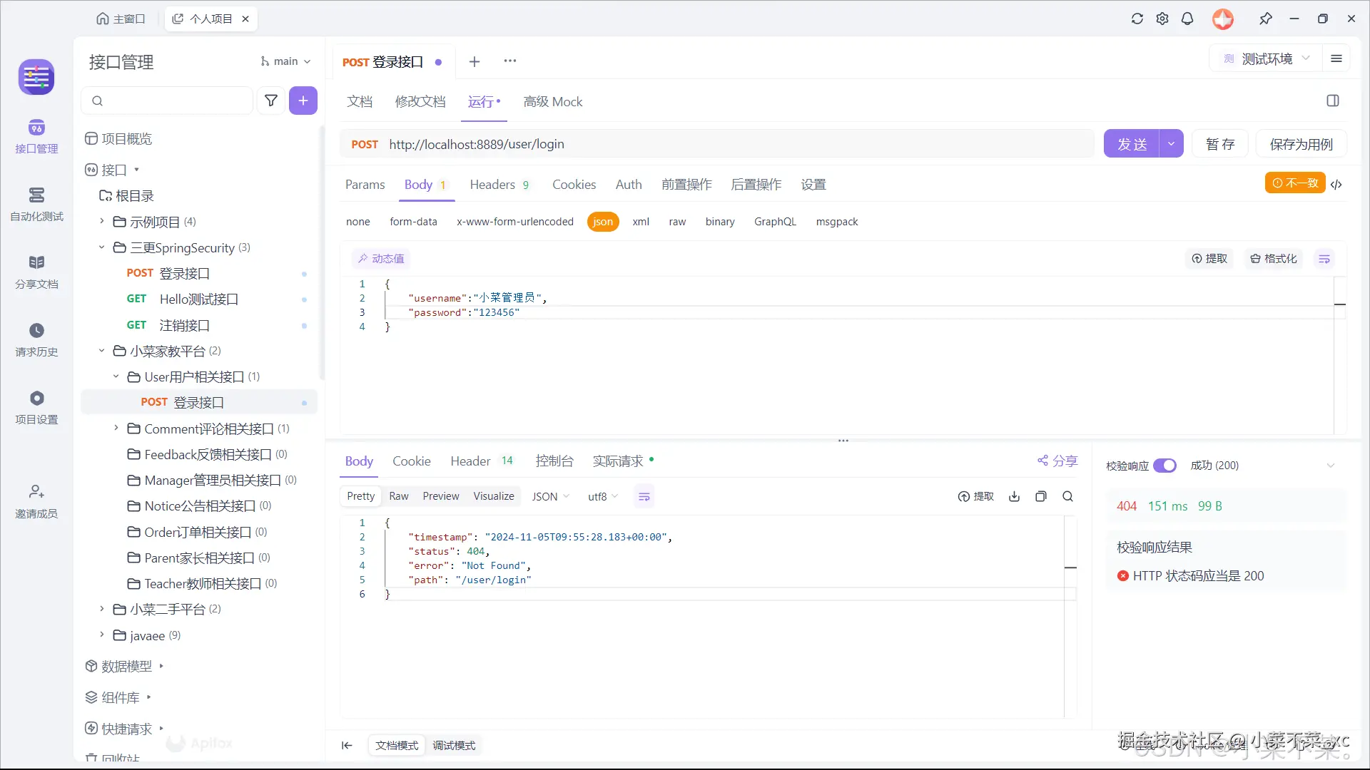 显示无法访问,是的,我们现在已经自定义了登录接口,所以这里就没有跳出来登录界面,因此我们要去Apifox或者Postman中进行测试