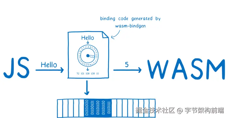 以上只是字符串类型的处理步骤,面对更复杂的类型需要更繁杂的胶水代码逻辑处理两者之间的数据类型转换,但是,我们可以使用wasm_bindgen 来避免编写这些胶水代码,通过它将自动创建所需的代码(在双方)以使更复杂的类型工作。
