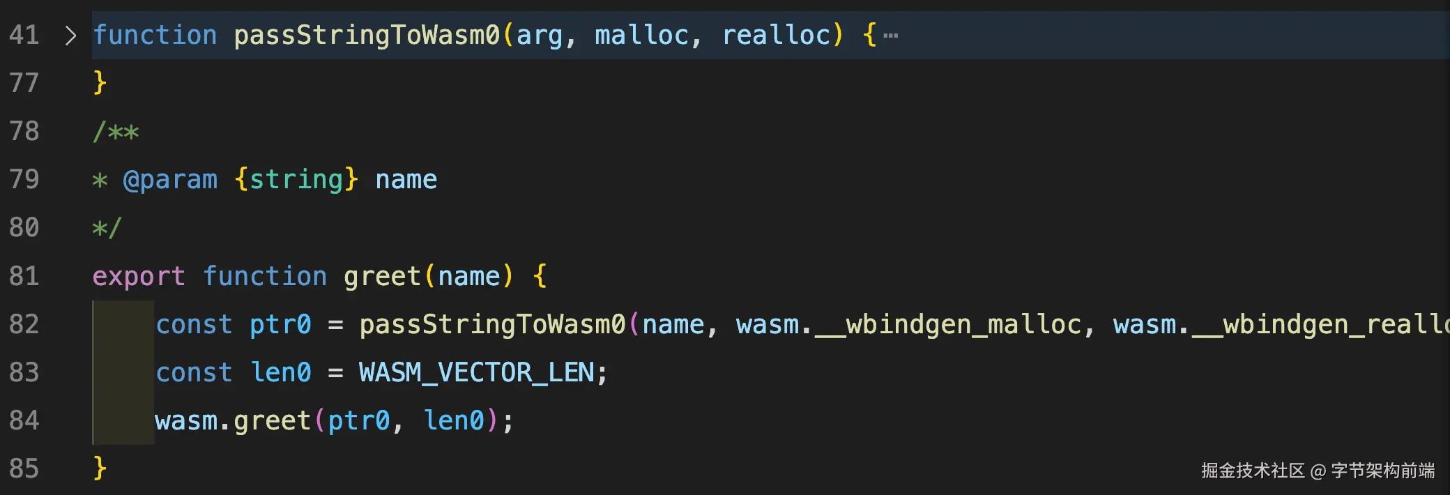 其中 greet_bg.js 文件就是 wasm 与 js 交互使用的胶水代码,可以分析一下看出,它基本符合前面提到的 wasm 和 js 之间的传值步骤。