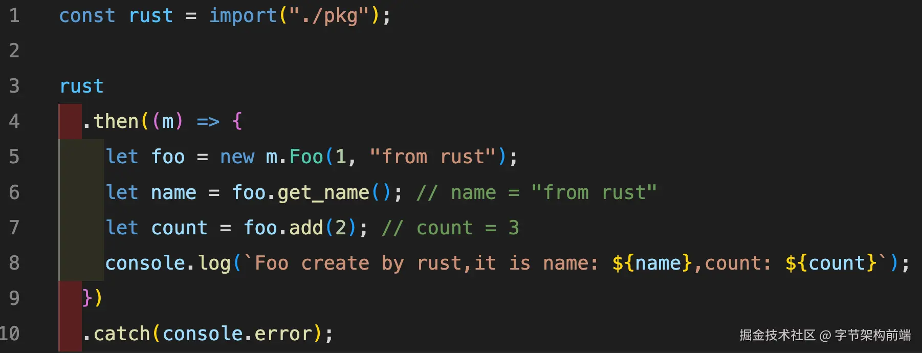 再执行一次 wasm-pack build ,可以在 greet_bg.js 胶水代码中看到导出了 export class Foo 供 JS 端使用,修改一下 index.js 代码,运行一下结果: