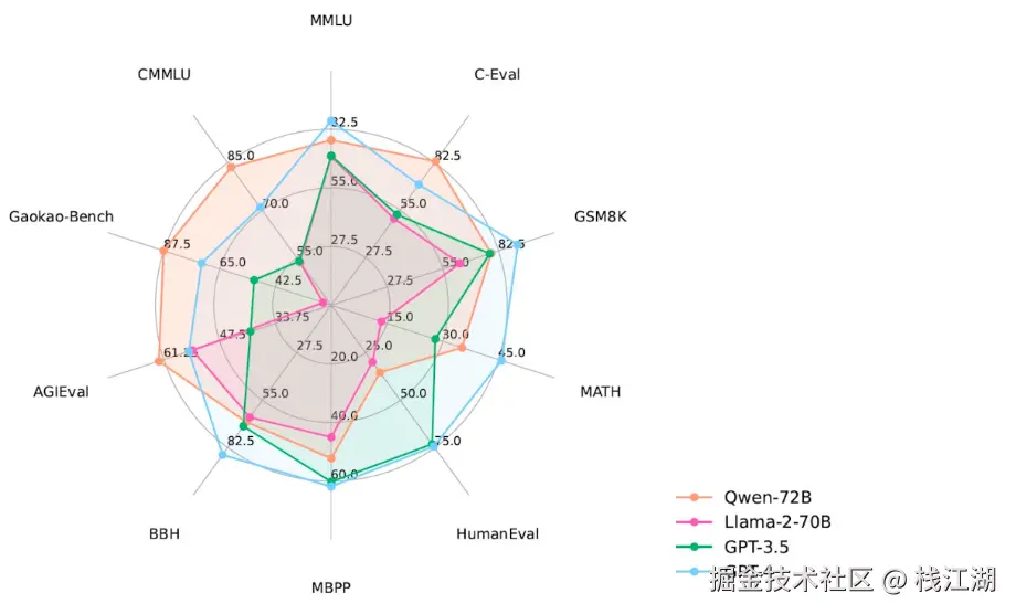 Qwen模型在一系列基准数据集上的表现优于类似模型大小的基线模型,例如,MMLU、C-Eval、GSM8K、MATH、HumanEval、MBPP、BBH等,Qwen-72 B在所有任务上的性能都优于LLaMA 2 - 70 B,在10个任务中有7个任务的性能优于GPT-3.5。