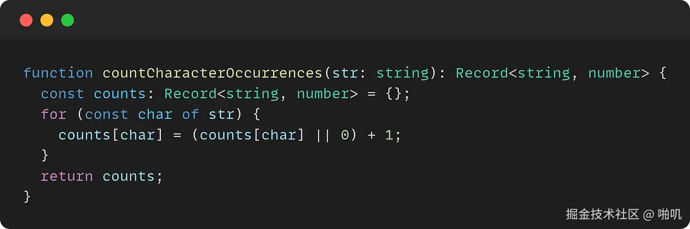 问题:“编写一个函数,统计一个字符串中每个字符的出现次数,并将结果作为一个对象返回。”