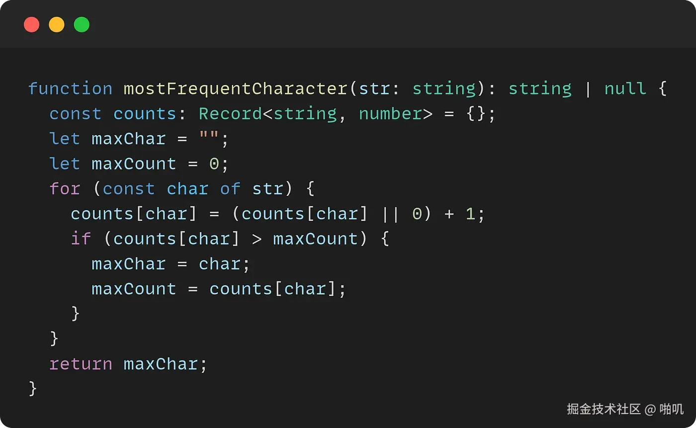 解释:跟踪字符的计数,根据需要更新最大计数和对应的字符。