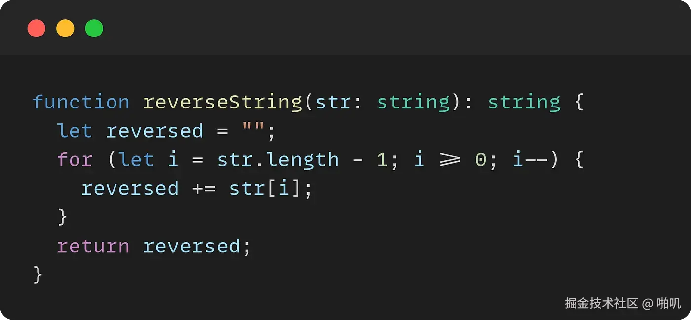 解释:这种方法从末尾开始一次一个字符地构建反转后的字符串。