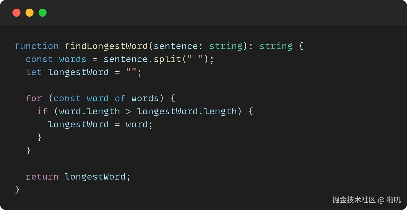解释:split(" ")将句子分割成一个单词数组。然后我们进行迭代以找到长度最长的单词。