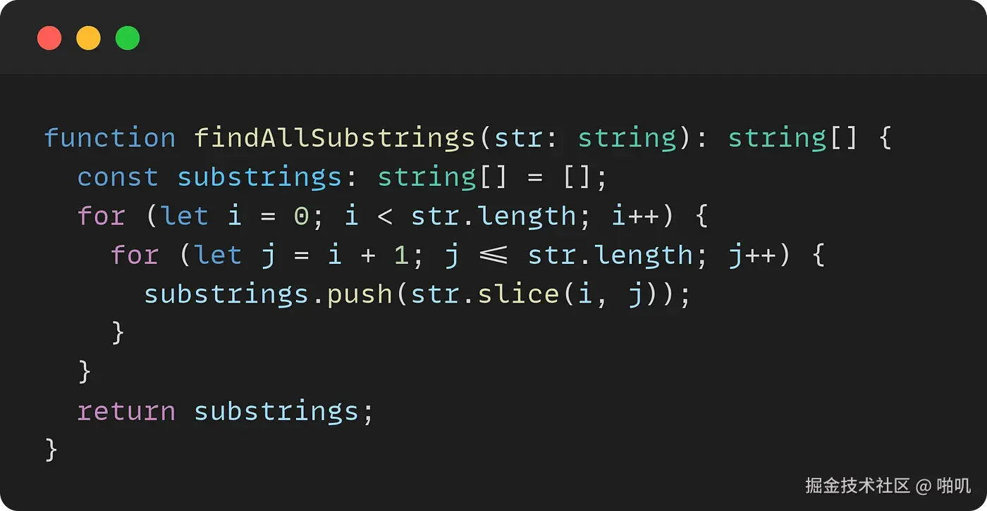 解释:外层循环设置子字符串的起始位置,内层循环设置子字符串的结束位置。 后续问题:“这个解决方案的时间复杂度是多少?以及如何进行优化?”